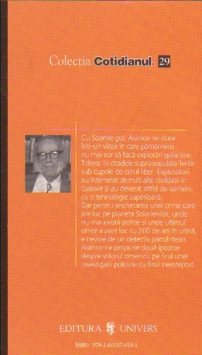 Romanul Soarele gol incheie prima perioada literara a lui Asimov. Pe planeta Solaria, populata de un grup de colonisti ce traiesc izolati unii de altii (nevoile lor fiind satisfacute de servitori roboti), are loc o crima care sfideaza toate Legile Roboticii, socind comunitatile Lumii exterioare. Dezlegarea misterului acestui asasinat revine detectivului new-yorkez Elijah Baley, ajutat de asistentul sau, robotul Daneel Olivaw. (Luca Marius)