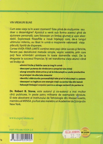 Cartea VIAȚA FĂRĂ LIMITE conţine zece paşi către succes şi fericire, fiecare pas dezvăluind metode simple, veşnic valabile, prin care poţi face schimbări uimitoare în toate domeniile vieţii. De la dragoste la succesul financiar, iţi vei transforma viata atunci când vei învăţa să: