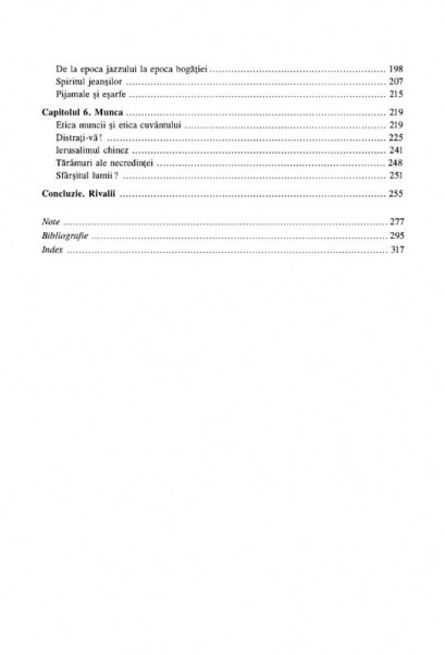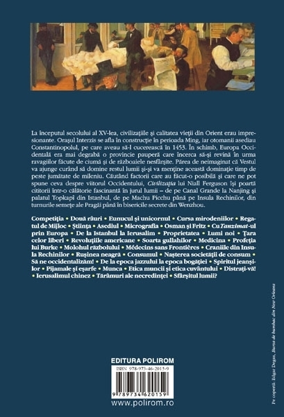 Traducere de Doris Mironescu si Andreea Mironescu La inceputul secolului al XV-lea, civilizatiile si calitatea vietii din Orient erau impresionante. Orasul Interzis se afla in constructie in perioada Ming, iar otomanii asediau Constantinopolul, pe care aveau sa-l cucereasca in 1453. In schimb, Europa Occidentala era mai degraba o provincie paupera care incerca sa-si revina in urma ravagiilor facute de ciuma si de razboaiele nesfirsite. Parea de neimaginat ca Vestul va ajunge curind sa domine restul lumii si-si va mentine aceasta dominatie timp de peste jumatate de mileniu. Cautind factorii care au facut-o posibila si care ne pot spune ceva despre viitorul Occidentului, Civilizatia lui Niall Ferguson isi poarta cititorii intr-o calatorie fascinanta in jurul lumii – de pe Canal Grande la Nanjing si palatul Topkapi din Istanbul, de pe Machu Picchu pina pe Insula Rechinilor, din turnurile semete ale Pragai pina in bisericile secrete din Wenzhou. Din cuprins: Competitia • Doua riuri • Eunucul si unicornul • Cursa mirodeniilor • Regatul de Mijloc • Stiinta • Asediul • Micrografia • Osman si Fritz • Cu Tanzimat-ul prin Europa • De la Istanbul la Ierusalim • Proprietatea • Lumi noi • Tara celor liberi • Revolutiile americane • Soarta gullahilor • Medicina • Profetia lui Burke • Molohul razboiului • Médecins sans Frontières • Craniile din Insula Rechinilor • Rusinea neagra • Consumul • Nasterea societatii de consum • Sa ne occidentalizam! • De la epoca jazzului la epoca bogatiei • Spiritul jeansilor • Pijamale si esarfe • Munca • Etica muncii si etica cuvintului • Distrati-va! • Ierusalimul chinez • Tarimuri ale necredintei • Sfirsitul lumii?
