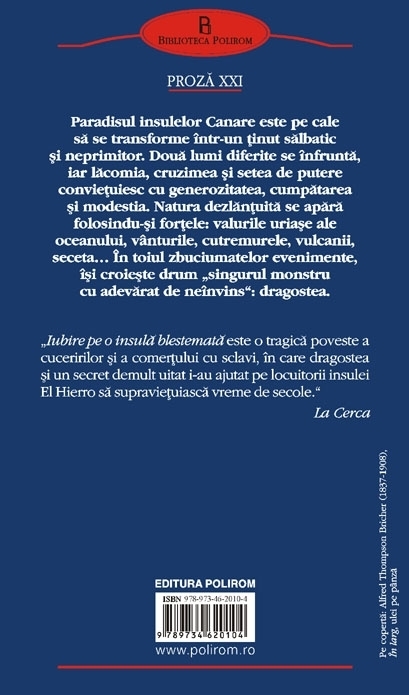 Alberto Vazquez-Figueroa este autorul bestsellerului Tuareg. Traducere din limba spaniola de Lavinia Similaru La sfirsitul secolului al XV-lea, paradisul terestru al insulelor Canare se preface intr-un tinut violent si neprimitor, din pricina unei substante misterioase ce pare sa ia mintile oamenilor civilizati. Doua lumi diferite se infrunta, iar lacomia, cruzimea si setea de putere convietuiesc cu generozitatea, cumpatarea si modestia. Un sirag de margele colorate are valoarea unui colier de diamante si poate ucide la fel. Natura dezlantuita se apara folosindu-si fortele: valurile uriase ale oceanului, vinturile, cutremurele, vulcanii, seceta… In toiul zbuciumatelor evenimente, isi croieste drum „singurul monstru cu adevarat de neinvins“, dragostea. Un secret pastrat cu strasnicie de-a lungul veacurilor iese la iveala, provocind o tragedie. Gloria dobindita pe cimpul de lupta nu-i readuce unui militar fericirea pierduta. Alberto Vazquez-Figueroa, unul dintre cei mai populari scriitori spanioli, evoca astfel, intr-un roman de neuitat, un episod dramatic din istoria meleagurilor sale natale, obtinind premiul „Alfonso X”pentru cel mai bun roman istoric din 2010 in Spania. „Iubire pe o insula blestemata este o tragica poveste a cuceririlor si a comertului cu sclavi, in care dragostea si un secret demult uitat i-au ajutat pe locuitorii insulei El Hierro sa supravietuiasca vreme de secole.” (La Cerca)