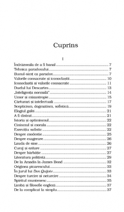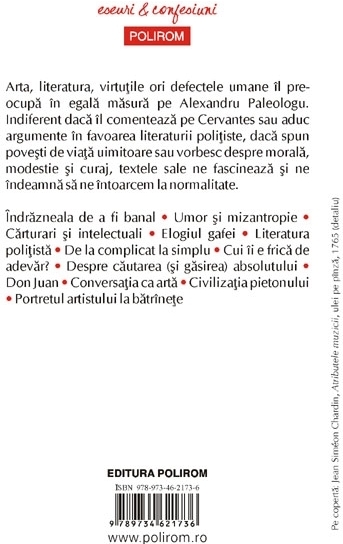 Arta, literatura, virtutile ori defectele umane il preocupa in egala masura pe Alexandru Paleologu. Indiferent daca il comenteaza pe Cervantes sau aduc argumente in favoarea literaturii politiste, daca spun povesti de viata uimitoare sau vorbesc despre morala, modestie si curaj, textele sale ne fascineaza si ne indeamna sa ne intoarcem la normalitate. Din cuprins: Indrazneala de a fi banal • Umor si mizantropie • Carturari si intelectuali • Elogiul gafei • Literatura politista • De la complicat la simplu • Cui ii e frica de adevar? • Despre cautarea (si gasirea) absolutului • Don Juan • Conversatia ca arta • Civilizatia pietonului • Portretul artistului la batrinete