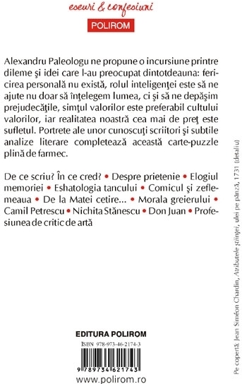 Alexandru Paleologu ne propune o incursiune printre dileme si idei care l-au preocupat dintotdeauna: fericirea personala nu exista, rolul inteligentei este sa ne ajute nu doar sa intelegem lumea, ci si sa ne depasim prejudecatile, simtul valorilor este preferabil cultului valorilor, iar realitatea noastra cea mai de pret este sufletul. Portrete ale unor cunoscuti scriitori si subtile analize literare completeaza aceasta carte-puzzle plina de farmec. Din cuprins: De ce scriu? In ce cred? • Despre prietenie • Elogiul memoriei • Eshatologia tancului • Comicul si zeflemeaua • De la Matei cetire... • Morala greierului • Camil Petrescu • Nichita Stanescu • Don Juan • Profe-siunea de critic de arta