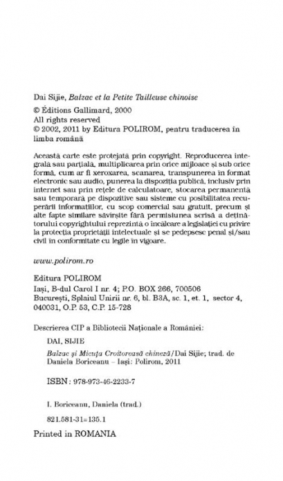 Traducere din limba franceza de Daniela Boriceanu Balzac si Micuta Croitoreasa chineza este o marturie originala a unui episod dramatic din perioada maoista de „reeducare” a tinerilor „intelectuali” (cel mai adesea adolescenti cu liceul neinceput), in sate izolate din regiuni montane. Romanul aduce in prim-plan doi adolescenti, fii de medici, considerati „dusmani ai poporului”, trimisi la „reeducare” pe Muntele Fenixului Ceresc, in plina Revolutie Culturala. Inarmati cu o vioara, cu un desteptator si, mai tirziu, cu traducerile interzise ale lui Balzac, Stendhal, Flaubert, Dumas, Hugo, Dostoievski, Dickens, Melville, Rolland, acestia isi executa muncile menite sa le invioreze constiinta revolutionara: cara excremente cu spinarea, lucreaza in mina si in orezarii si vizioneaza filme (nord-coreene sau albaneze) pe care le joaca apoi in fata satenilor. Usa evadarii li se intredeschide insa prin lectura la lumina lampii, departe de privirile vigilente ale primarului satului, a marilor autori occidentali pusi la index. Si prima care trece dincolo de ea este Micuta Croitoreasa, iubita unuia dintre protagonisti – si ea reeducata, dar sentimental, de Balzac.
