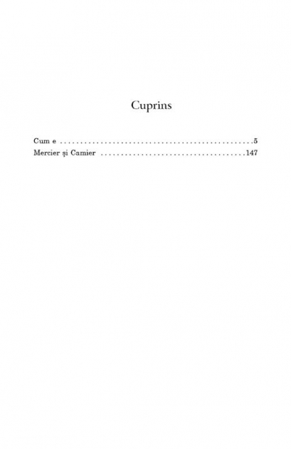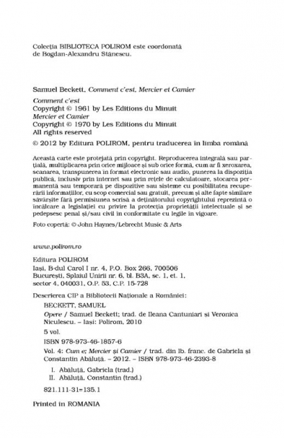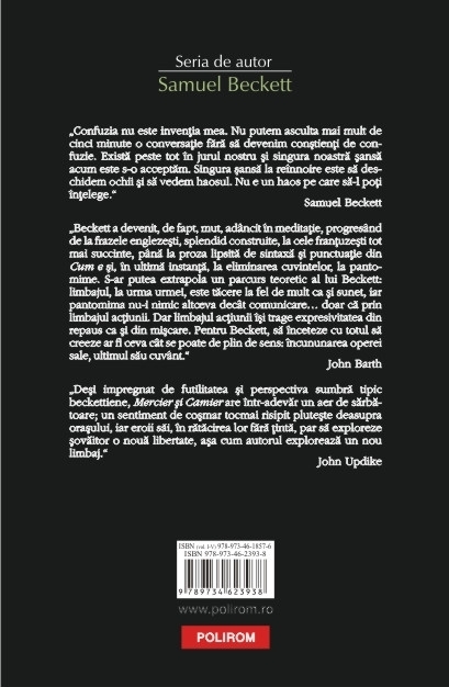 Traduceri din limba franceza de Gabriela si Constantin Abaluta Samuel Beckett este laureatul Premiului Nobel pentru Literatura pe anul 1969, unul dintre cei mai profunzi si originali scriitori ai secolului XX. Cel de-al patrulea volum din Seria de autor „Samuel Beckett” reuneste romanele Cum e (1961) si Mercier si Camier (1970), considerate doua dintre cele mai subtile experimente stilistice beckettiene. Avind in centru cupluri de personaje complementare care le prefigureaza pe acelea din piesele sale de teatru si folosind procedee specifice dramaturgiei, fiecare dintre cele doua romane exploreaza o dimensiune distincta a voiajului: timpul sau spatiul. Daca in Cum e naratorul, care se tiraste prin noroi spre dublul sau existential, acorda o importanta esentiala timpului, trezindu-ne constiinta nemarginirii, eternitatii si inexorabilitatii sale, in Mercier si Camier cele doua personaje cutreiera un loc fara identitate, un spatiu labirintic, pluvios si inselator, in cautarea unui „altundeva“ care se destrama de indata ce este atins. Proza fragmentata si limbajul minimalist al celor doua romane anunta deja marile capodopere teatrale beckettiene. „Confuzia nu este inventia mea. Nu putem asculta mai mult de cinci minute o conversatie fara sa devenim constienti de confuzie. Exista peste tot in jurul nostru si singura noastra sansa acum este s-o acceptam. Singura sansa la reinnoire este sa des-chidem ochii si sa vedem haosul. Nu e un haos pe care sa-l poti intelege.” (Samuel Beckett) „Beckett a devenit, de fapt, mut, adincit in meditatie, progresind de la frazele englezesti, splendid construite, la cele frantuzesti tot mai succinte, pina la proza lipsita de sintaxa si punctuatie din Cum e si, in ultima instanta, la eliminarea cuvintelor, la pantomime. S-ar putea extrapola un parcurs teoretic al lui Beckett: limbajul, la urma urmei, este tacere la fel de mult ca si sunet, iar pantomima nu-i nimic altceva decit comunicare… doar ca prin limbajul actiunii. Dar limbajul actiunii isi trage expresivitatea din repaus ca si din miscare. Pentru Beckett, sa inceteze cu totul sa creeze ar fi ceva cit se poate de plin de sens: incununarea operei sale, ultimul sau cuvint.” (John Barth) „Desi impregnat de futilitatea si perspectiva sumbra tipic beckettiene, Mercier si Camier are intr-adevar un aer de sarba-toare; un sentiment de cosmar tocmai risipit pluteste deasupra orasului, iar eroii sai, in ratacirea lor fara tinta, par sa exploreze sovaitor o noua libertate, asa cum autorul exploreaza un nou limbaj.” (John Updike)
