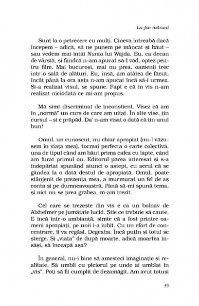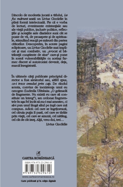 Dincolo de modestia jucata a titlului, La foc marunt arata un Livius Ciocarlie in plina forma intelectuala. Fie ca e vorba de lecturi, evenimente existentiale sau ale vietii publice, inclusiv politice, reflectiile si notatiile sale diaristice sint cit se poate de vii, de proaspete si de spirituale, stimulind reactii pe masura din partea cititorilor. Descoperim, in aceste pagini sclipitoare, un Livius Ciocarlie mai implicat si mai combativ, un „avocat al batrinetii constiente de sine” care-si pune in scena vulnerabilitatile cu acelasi farmec discret al autoironiei devenit, deja, marca inregistrata. „In ultimele carti publicate principiul director a fost aleatoriul sau, altfel spus, ce-i trece omului prin cap. De rindul acesta, convins de inexistenta unui eu omogen (Ludmila Ulitskaia: „O gramada de fragmente. Nu exista eu care sa constituie un intreg”), am ordonat fragmentele in asa fel incit sa nu-i mai amestec, ci sa-i pun unul linga altul pe insii care ma compun. Adica: cel care se ingrijoreaza, cel caruia putin ii pasa, cel care se tiriie prin viata, cel care se amuza, cel nating, cel cit de cit istet. Altii, vreo doi, trei…” (Livius Ciocarlie)