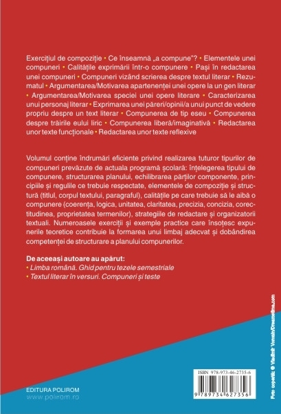 Volumul contine indrumari eficiente privind realizarea tuturor tipurilor de compuneri prevazute de actuala programa scolara: intelegerea tipului de compunere, structurarea planului, echilibrarea partilor componente, principiile si regulile ce trebuie respectate, elementele de compozitie si structura (titlul, corpul textului, paragraful), calitatile pe care trebuie sa le aiba o compunere (coerenta, logica, unitatea, claritatea, precizia, concizia, corectitudinea, proprietatea termenilor), strategiile de redactare si organizatorii textuali. Numeroasele exercitii si exemple practice care insotesc expunerile teoretice contribuie la formarea unui limbaj adecvat si dobindirea competentei de structurare a planului compunerilor.