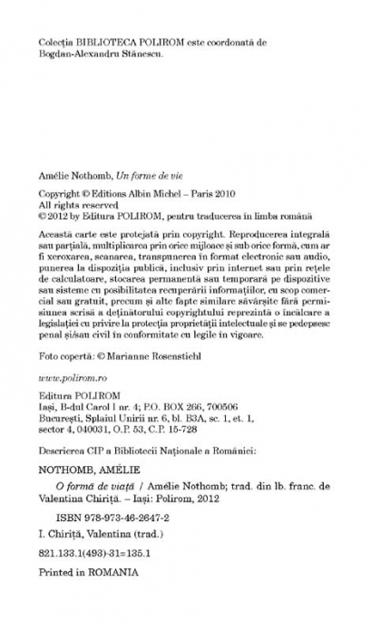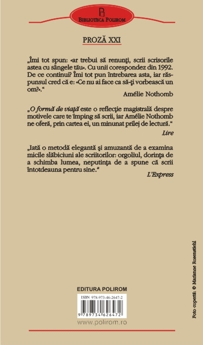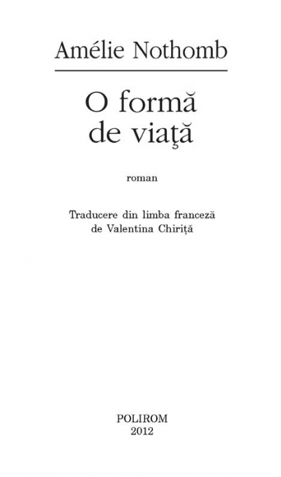 Traducere din limba franceza de Valentina Chirita Romanul O forma de viata (2010) relateaza povestea corespondentei dintre scriitoarea Amelie Nothomb si soldatul american Melvin Mapple, care ii scrie din Bagdad. Treptat, relatia epistolara ii apropie pe cei doi, scriitoarea se imprieteneste cu soldatul obez si fiecare infrunta linia inselatoare de demarcatie dintre fantezie si realitate. Melvin Mapple are o lupta de dus cu corpul sau si cu vinovatia care il asalteaza, iar scriitoarea se confrunta cu problema morala a implicarii fanteziste si pline de elan intr-o realitate ce se dovedeste a avea o fata ascunsa. Iluzia este o forma mutanta de viata, iar cartea atrage atentia asupra intrebarilor ce se nasc atunci cind realizam ca judecam si operam in real cu instrumentele, uneori inadecvate, ale fanteziei. „Imi tot spun: «ar trebui sa renunti, scrii scrisorile astea cu singele tau». Cu unii corespondez din 1992. De ce continui? Imi tot pun intrebarea asta, iar raspunsul cred ca e: «Ce nu ai face ca sa-ti vorbeasca un om?».” (Amelie Nothomb) „O forma de viata este o reflectie magistrala despre motivele care te imping sa scrii, iar Amelie Nothomb ne ofera, prin cartea ei, un minunat prilej de lectura.” (Lire) „Iata o metoda eleganta si amuzanta de a examina micile slabiciuni ale scriitorilor: orgoliul, dorinta de a schimba lumea, neputinta de a spune ca scrii intotdeauna pentru sine.” (L’Express)