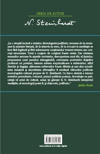 Editie ingrijita, studiu introductiv, note, referinte critice si indici de Stefan Iloaie Repere biobibliografice de Virgil Bulat Seria de autor „N. Steinhardt” apare in coeditare cu Manastirea „Sfinta Ana” Rohia. Programat initial sa apara in vara lui 1989, Monologul polifonic a fost publicat abia in 1991, la doi ani dupa moartea autorului. In stilul sau caracteristic, N. Steinhardt acopera in eseurile reunite in volum o paleta literara larga, de la SF la generatia interbelica, de la Ion Creanga la Lucian Blaga si Octavian Paler, de la Sarmanul Dionis la La Paradis General si „antiromanul” lui Bedros Horasangian, dar nu ezita nici sa-si exprime opiniile cu privire la libertatea indivizilor si a popoarelor in celebrul text „Suflet de rob (sau taina libertatii)”, care a atras atentia Securitatii. „La o simpla lectura a textelor Monologului polifonic, trecerea de la recenzare la amintire literara, de la interviu la eseu, de la evocare la meditatie se face fara legatura si fara subsumarea continutului vreunui termen sau concept structurant. Totul e curgere de continut foarte variat. Dar cautarea sensurilor ascunse in spatele cuvintelor, descoperirea unui tilc al faptelor, propunerea unui paradox inimaginabil, creionarea portretelor ilustrilor profesori ori prieteni, tratarea adesea surprinzatoare a subiectelor, stilul deschis si degajat, alaturarea subiectelor foarte diferite si mai ales actualitatea tematica si sinceritatea afirmatiilor ii mediaza cititorului polifonia monologului cultural propus de N. Steinhardt. Ca intr-o sinteza a tuturor scrierilor precedente, volumul, primul publicat postum, dovedeste cu prisosinta ca actul de cultura, unul, isi gaseste in N. Steinhardt interpretul multiplu, ca monologul poate fi, si chiar este, polifonic.” (Stefan Iloaie)