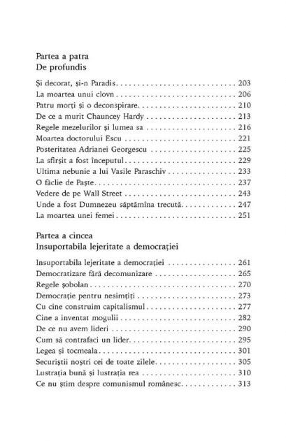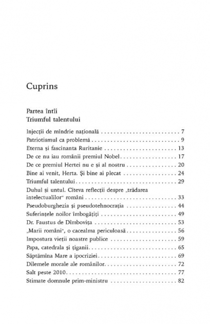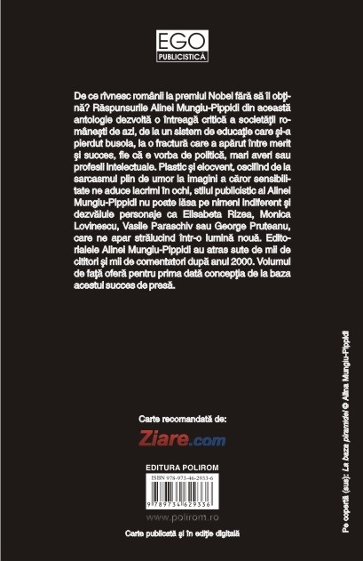 De ce rivnesc romanii la premiul Nobel fara sa il obtina? Raspunsurile Alinei Mungiu-Pippidi din aceasta antologie dezvolta o intreaga critica a societatii romanesti de azi, de la un sistem de educatie care si-a pierdut busola, la o fractura care a aparut intre merit si succes, fie ca e vorba de politica, mari averi sau profesii intelectuale. Plastic si elocvent, oscilind de la sarcasmul plin de umor la imagini a caror sensibilitate ne aduce lacrimi in ochi, stilul publicistic al Alinei Mungiu-Pippidi nu poate lasa pe nimeni indiferent si dezvaluie personaje ca Elisabeta Rizea, Monica Lovinescu, Vasile Paraschiv sau George Pruteanu, care ne apar stralucind intr-o lumina noua. Editorialele Alinei Mungiu-Pippidi au atras sute de mii de cititori si mii de comentatori dupa anul 2000. Volumul de fata ofera pentru prima data conceptia de la baza acestui succes de presa.