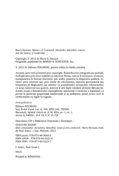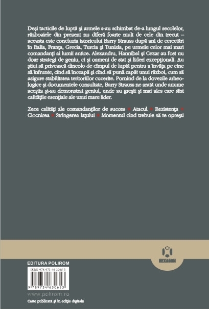 Traducere de Paul Aneci O exceptionala prezentare comparativa a celor mai mari comandanti ai lumii antice. Desi tacticile de lupta si armele s-au schimbat de-a lungul secolelor, razboaiele din prezent nu difera foarte mult de cele din trecut – aceasta este concluzia istoricului Barry Strauss dupa ani de cercetari in Italia, Franta, Grecia, Turcia si Tunisia, pe urmele celor mai mari comandanti ai lumii antice. Alexandru, Hannibal si Cezar au fost nu doar strategi de geniu, ci si oameni de stat si lideri exceptionali. Au stiut sa priveasca dincolo de cimpul de lupta pentru a invata pe cine sa infrunte, cind sa inceapa si cind sa puna capat unui razboi, cum sa asigure stabilitatea teritoriilor cucerite. Pornind de la dovezile arheologice si documentele consultate, Barry Strauss ne arata unde anume acestia si-au demonstrat geniul, unde au gresit si mai ales care sint calitatile esentiale ale unui mare lider.