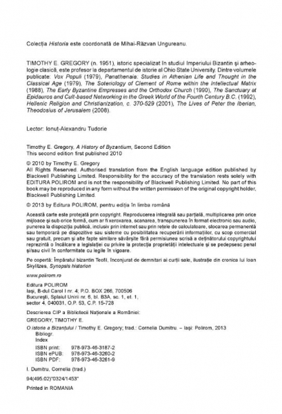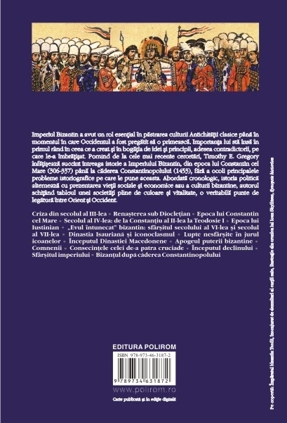 Traducere de Cornelia Dumitru Imperiul Bizantin a avut un rol esential in pastrarea culturii Antichitatii clasice pina in momentul in care Occidentul a fost pregatit sa o primeasca. Importanta lui sta insa in primul rind in ceea ce a creat si in bogatia de idei si principii, adesea contradictorii, pe care le-a imbratisat. Pornind de la cele mai recente cercetari, Timothy E. Gregory infatiseaza succint intreaga istorie a Imperiului Bizantin, din epoca lui Constantin cel Mare (306-337) pina la caderea Constantinopolului (1453), fara a ocoli principalele probleme istoriografice pe care le pune aceasta. Abordata cronologic, istoria politica alterneaza cu prezentarea vietii sociale si economice sau a culturii bizantine, autorul schitind tabloul unei societati pline de culoare si vitalitate, o veritabila punte de legatura intre Orient si Occident. Din cuprins: Criza din secolul al III-lea • Renasterea sub Diocletian • Epoca lui Constantin cel Mare • Secolul al IV-lea: de la Constantiu al II-lea la Teodosie I • Epoca lui Iustinian • „Evul intunecat” bizantin: sfirsitul secolului al VI-lea si secolul al VII-lea • Dinastia Isauriana si iconoclasmul • Lupte nesfirsite in jurul icoanelor • Inceputul Dinastiei Macedonene • Apogeul puterii bizantine • Comnenii • Consecintele celei de-a patra cruciade • Inceputul declinului • Sfirsitul imperiului • Bizantul dupa caderea Constantinopolului
