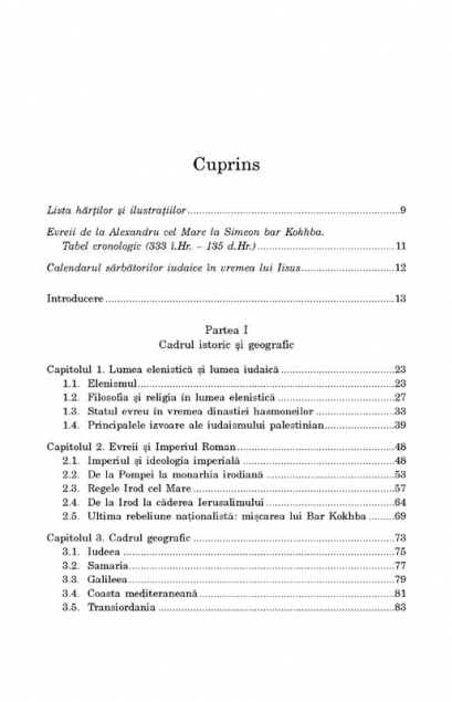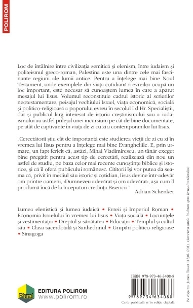 Loc de intilnire intre civilizatia semitica si elenism, intre iudaism si politeismul greco-roman, Palestina este una dintre cele mai fasci-nante regiuni ale lumii antice. Pentru a intelege mai bine Noul Testament, unde exemplele din viata cotidiana a evreilor ocupa un loc important, este necesar sa cunoastem lumea in care a aparut mesajul lui Iisus. Volumul reconstituie cadrul istoric al scrierilor neotestamentare, peisajul vechiului Israel, viata economica, sociala si politico-religioasa a poporului evreu in secolul I d.Hr. Specialistii, dar si publicul larg interesat de istoria crestinismului sau a iudaismului au astfel prilejul unei incursiuni pe cit de bine documentate, pe atit de captivante in viata de zi cu zi a contemporanilor lui Iisus. „Cercetatorii stiu cit de importanta este studierea vietii de zi cu zi in vremea lui Iisus pentru a intelege mai bine Evangheliile. E, prin urmare, un fapt fericit ca, astazi, Mihai Vladimirescu, un tinar exeget bine pregatit pentru acest tip de cercetari, realizeaza din nou un astfel de studiu, pe baza celor mai recente cunostinte biblice si istorice, si ca il ofera publicului romanesc. Cititorii isi vor putea da seama ca, privit in mediul sau istoric si cotidian, Iisus devine intr-adevar om printre oameni, «Dumnezeu adevarat si om adevarat», asa cum il proclama inca de la inceputuri credinta Bisericii.” (Adrian Schenker) Din cuprins: Lumea elenistica si lumea iudaica • Evreii si Imperiul Roman • Economia Israelului in vremea lui Iisus • Viata sociala • Locuintele si vestimentatia • Dreptul si sanatatea • Educatia • Templul si cultul sau • Clasa sacerdotala si Sanhedrinul • Grupari politico-religioase • Sinagoga