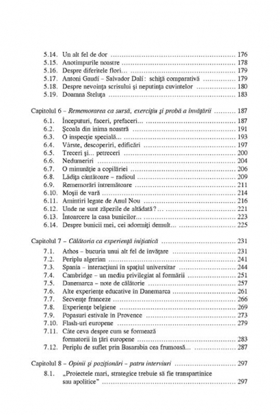 Rezultatul unor preocupari constante ale autorului, lucrarea propune un discurs despre educatie care, fara sa neglijeze dimensiunea teoretica, pune accent mai putin pe concepte si mai mult pe experienta traita si asumata ca subiect al reflectiei pedagogice. Tematica abordata este vasta, mergind de la calitatea si performanta in invatamint, noile provocari si exigente in educatie, dilemele formarii in contextul noilor medii culturale si educatia religioasa pina la rememorarea ca sursa si proba a invatarii si calatoria ca experienta de initiere. Problematica si maniera ei de tratare apropiata de eseu recomanda cartea unui public larg: specialisti in stiintele educatiei, cadre didactice din invatamintul de toate nivelurile, studenti, parinti si elevi.