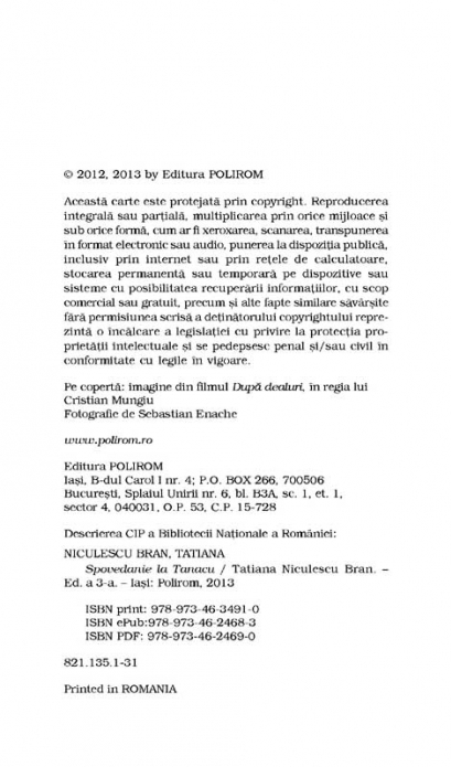 Comandă online cartea "Spovedanie la Tanacu (ediție de buzunar)" la 10,60 lei isbn 9789734634910 scrisă de Tatiana Niculescu Bran , Tatiana Niculescu Bran, tiparită la editura Polirom face parte din colecția Top 10+. cu plata ramburs sau online cu cardul. Momentan titlul "Spovedanie la Tanacu (ediție de buzunar)" nu este disponibil însa vă puteți înscrie pentru a fi notificat în momenul reaprovizionarii.