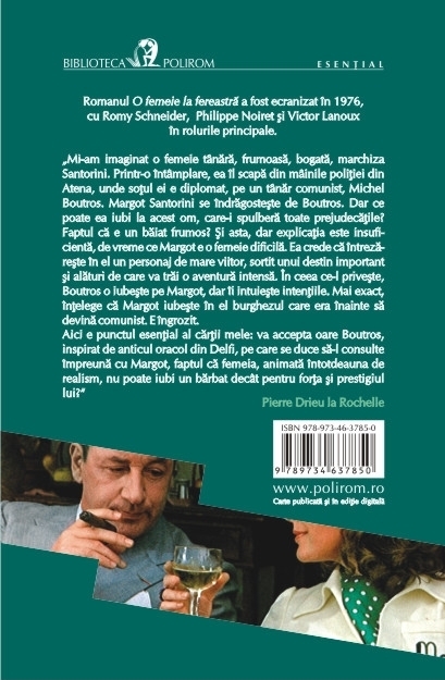 Traducere din limba franceza de Ileana Cantuniari Romanul O femeie la fereastra a fost ecranizat in 1976, cu Romy Schneider, Philippe Noiret si Victor Lanoux in rolurile principale. Poveste de dragoste intre o aristocrata, marchiza Santorini, si un comunist, Michel Boutros, O femeie la fereastra este deopotriva marturia aspiratiei autorului de a se sacrifica pentru o cauza in care crede. In 1936, aflata in Grecia, unde sotul ei este diplomat, Margot Santorini traieste o viata searbada pina cind, intr-o seara, de la fereastra camerei sale de hotel, vede un barbat urmarit de politie si decide sa-i ofere o ascunzatoare. Fugarul se dovedeste a fi Michel Boutros, un militant ostil regimului. Curajul, idealismul si umanitatea tinarului o seduc imediat pe Margot. „Mi-am imaginat o femeie tinara, frumoasa, bogata, marchiza Santorini. Printr-o intimplare, ea il scapa din miinile politiei din Atena, unde sotul ei e diplomat, pe un tinar comunist, Michel Boutros. Margot Santorini se indragosteste de Boutros. Dar ce poate ea iubi la acest om, care-i spulbera toate prejudecatile? Faptul ca e un baiat frumos? Si asta, dar explicatia este insuficienta, de vreme ce Margot e o femeie dificila. Ea crede ca intrezareste in el un personaj de mare viitor, sortit unui destin important si alaturi de care va trai o aventura intensa. In ceea ce-l priveste, Boutros o iubeste pe Margot, dar ii intuieste intentiile. Mai exact, intelege ca Margot iubeste in el burghezul care era inainte sa devina comunist. E ingrozit. Aici e punctul esential al cartii mele: va accepta oare Boutros, inspirat de anticul oracol din Delfi, pe care se duce sa-l consulte impreuna cu Margot, faptul ca femeia, animata intotdeauna de realism, nu poate iubi un barbat decit pentru forta si prestigiul lui?” (Pierre Drieu la Rochelle) „Pierre Drieu la Rochelle este un scriitor minunat, un stilist de prima marime.” (Andre Malraux)