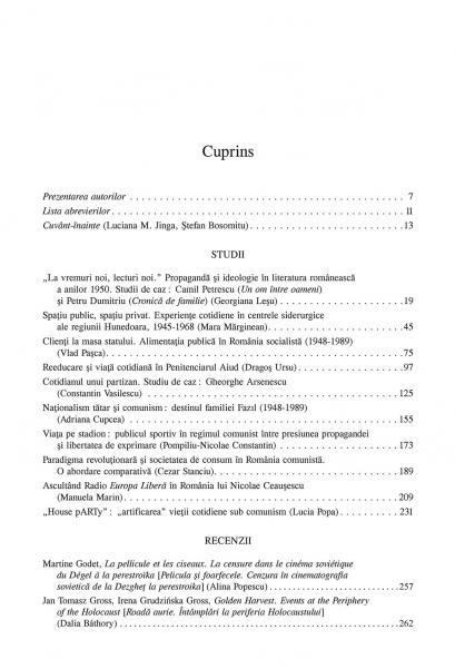 Numar coordonat de Luciana M. Jinga si Stefan Bosomitu Volumul de fata propune publicului analize referitoare la istoria regimului comunist din Romania din perspective inedite in discursul istoriografic. Studiile sugereaza o abordare de jos in sus a regimului comunist, analizind structuri si practici ale cotidianului. Contributiile nu se rezuma la a reconstrui structuri esentiale ale vietii de zi cu zi, ci merg mai departe – identificind acele secvente ale cotidianului care iau nastere si se dezvolta in contextul existentei unui dialog intre regimul comunist si institutiile sale, pe de o parte, si societate, pe de alta parte. Ca un raspuns la abordarile traditionale, volumul ne sugereaza imaginea unui individ/cetatean extrem de atent la realitatile sociale, economice, culturale si politice ale epocii pe care o traieste, ce se acomodeaza acestora la nivel cotidian, dezvoltind tactici si trucuri care faciliteaza adaptarea si rezistenta in fata regimului. Mai mult, chiar concluziile studiilor sugereaza ca, atunci cind acest nou cotidian a devenit o norma, regimul comunist a parut sa fie nevoit sa tina seama, la rindul lui, de toate aceste transformari.