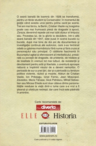 O seara banala de toamna din 1928 se transforma, pentru un tinar student la Conservator, in momentul de gratie cind acesta urca pentru prima oara pe scena. Trei ani mai tirziu, la Berlin, Cristian Vasile va inregistra poate cea mai frumoasa piesa de dragoste a epocii, Zaraza, devenind repede cel mai iubit dizeur al timpului sau. Povestea lui, de la glorie la decadere, intr-o alta seara banala din 1947, este pusa in scena bucata cu bucata, dupa mai bine de doi ani de documentare si investigatie continua ale autorului, care s-au terminat odata cu gasirea mormintului fara nume si fara cruce al personajului sau principal. O calatorie fascinanta in Bucurestiul agitat si efervescent al interbelicului, presarata cu povesti de dragoste, de prietenie, de tradare si de loialitate in vremuri tot mai tulburi, de rezistenta si devotament pentru arta si libertate, o aventura aproape nebuna a implinirii visului de a deveni nemuritor. O perioada de aur a unei tari, dar si o perioada cu tensiuni politice violente, razboi si moarte. Alaturi de Cristian Vasile, Ion Pribeagu, Ionel Fernic, Jean Moscopol, Zavaidoc, Maria Tanase, Gica Petrescu, Mihail Sebastian sau Mircea Eliade sint doar citeva dintre personalitatile readuse la viata dintr-o lume care s-a vrut a fi stearsa si uitata pe nedrept, dar care inca este pastrata in amintire.