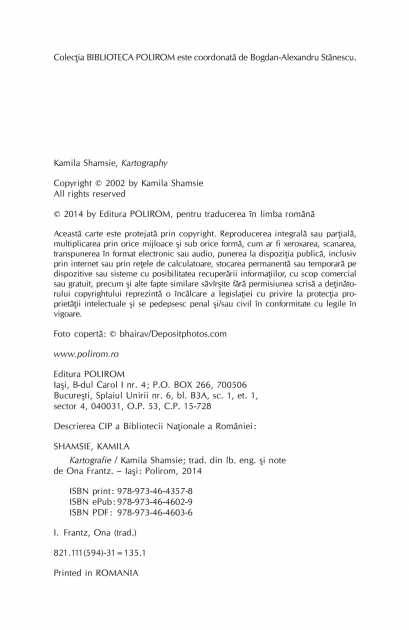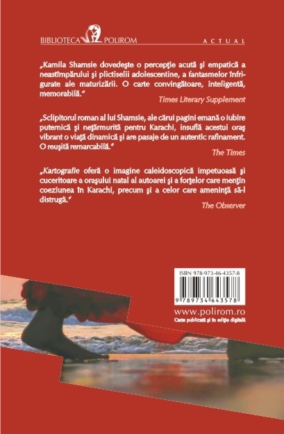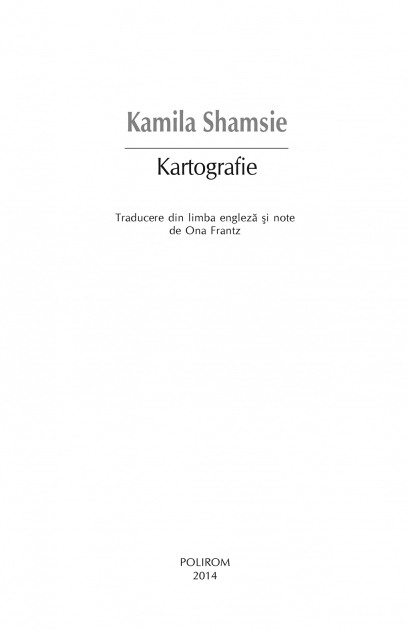 Traducere din limba engleza si note de Ona Frantz „Mai presus de orice, Kartografie este o poveste de iubire autentica.” (Guardian) Kartografie este o poveste de iubire impregnata cu un umor fin si o fireasca nostalgie dupa anii luminosi ai copilariei. Tinara Raheen si Karim, prietenul ei din copilarie, sint prinsi intr-o relatie ce oscileaza intre prietenie inflacarata si dragoste nemarturisita, ce se perpetueaza peste ani. Cei doi traiesc in Karachi si isi petrec aproape tot timpul impreuna, in mediul securizat al caselor parintilor, caci orasul e tulburat de conflicte etnice. Despartiti in urma emigrarii familiei lui Karim in Anglia, tinerii se intilnesc din nou, dar tensiunile acumulate in timp explodeaza atit in societatea pakistaneza, cit si intre ei doi. Exista un secret care le invenineaza relatia si care are legatura cu parintii lor, un schimb ciudat de logodnice si o tradare provocata de lasitate, dar si cu istoria tulburata a Pakistanului. Caci romanul Kamilei Shamsie este in primul rind despre oameni, despre brutalitatea unei societati, despre zadarnicele chinuri ale dragostei intr-o lume divizata si intoleranta. „Kamila Shamsie dovedeste o perceptie acuta si empatica a neastimparului si plictiselii adolescentine, a fantasmelor infrigurate ale maturizarii. O carte convingatoare, inteligenta, memorabila.” (Times Literary Supplement) „Sclipitorul roman al lui Shamsie, ale carui pagini emana o iubire puternica si netarmurita pentru Karachi, insufla acestui oras vibrant o viata dinamica si are pasaje de un autentic rafinament. O reusita remarcabila.” (The Times) „Kartografie ofera o imagine caleidoscopica impetuoasa si cuceritoare a orasului natal al autoarei si a fortelor care mentin coeziunea in Karachi, precum si a celor care ameninta sa-l distruga.” (The Observer) Carte recomandata de
