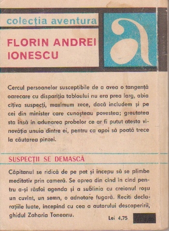 Comandă online cartea "Suspectii se demasca" la 6,20 lei scrisă de Florin Andrei Ionescu, tiparită la editura Albatros face parte din colecția Aventura în anul 1973. cu plata ramburs sau online cu cardul. Momentan titlul "Suspectii se demasca" nu este disponibil însa vă puteți înscrie pentru a fi notificat în momenul reaprovizionarii.