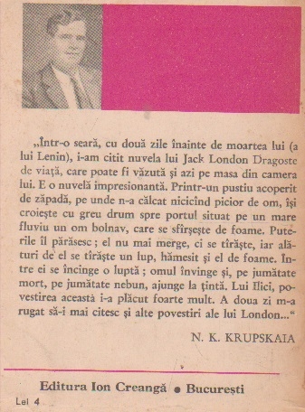 Comandă online cartea "Dragoste de viata (nuvele si povestiri)" la 10,50 lei scrisă de Jack London Petre Solomon, tiparită la editura Ion Creanga face parte din colecția Biblioteca Scolarului. cu plata ramburs sau online cu cardul. Momentan titlul "Dragoste de viata (nuvele si povestiri)" nu este disponibil însa vă puteți înscrie pentru a fi notificat în momenul reaprovizionarii.