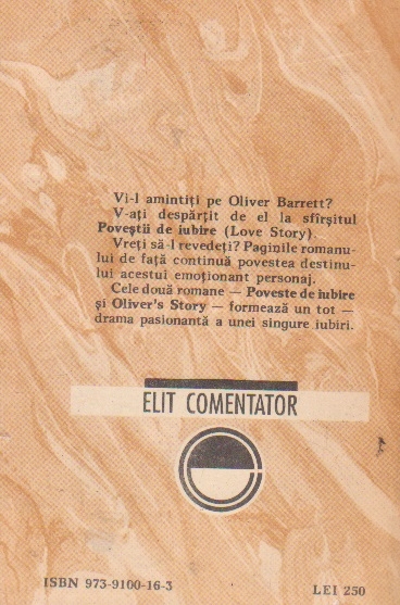 Comandă online cartea "Oliver s Story (Love Story continua)" la 10,50 lei scrisă de Erich Segal Junona Tutunea, tiparită la editura Elit Comentator în anul 1992. cu plata ramburs sau online cu cardul. Momentan titlul "Oliver s Story (Love Story continua)" nu este disponibil însa vă puteți înscrie pentru a fi notificat în momenul reaprovizionarii.