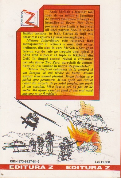 Comandă online cartea "Misiune fulgeratoare" la 15,90 lei scrisă de Andy McNab, tiparită la editura Editura Z face parte din colecția War în anul 1997. cu plata ramburs sau online cu cardul. Momentan titlul "Misiune fulgeratoare" nu este disponibil însa vă puteți înscrie pentru a fi notificat în momenul reaprovizionarii.