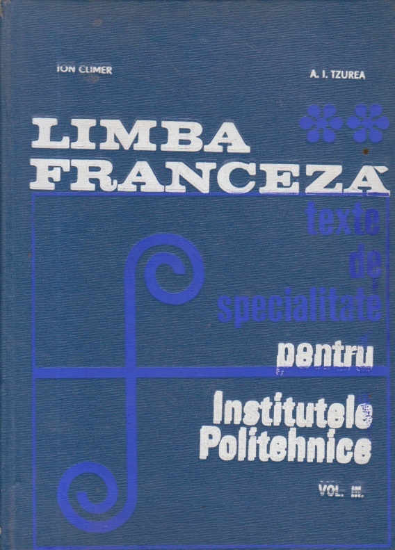 Comandă online cartea "Limba franceza - Texte de specialitate pentru Institutele politehnice, Volumul al III-lea" la 13,60 lei scrisă de Ion Climer, tiparită la editura Didactica si Pedagogica în anul 1968 cu un număr de 154 pagini. cu plata ramburs sau online cu cardul. Momentan titlul "Limba franceza - Texte de specialitate pentru Institutele politehnice, Volumul al III-lea" nu este disponibil însa vă puteți înscrie pentru a fi notificat în momenul reaprovizionarii.