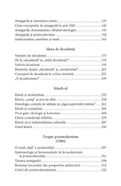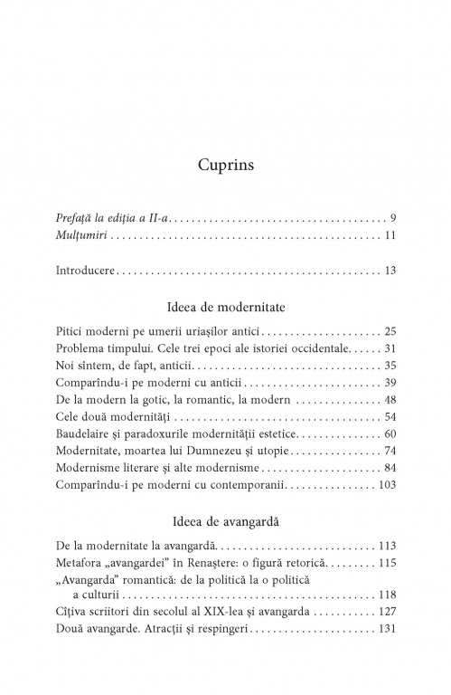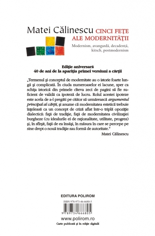 „Termenul şi conceptul de modernitate au o istorie foarte lungă şi complicată. În ciuda numeroaselor ei lacune, sper ca schiţa istorică din primele cîteva zeci de pagini să fie suficient de validă ca ipoteză de lucru. Rolul acestei ipoteze este acela de a-l pregăti pe cititor să urmărească argumentul principal al cărţii, şi anume că modernitatea estetică trebuie înţeleasă ca un concept de criză aflat într-o triplă opoziţie dialectică: faţă de tradiţie, faţă de modernitatea civilizaţiei burgheze (cu idealurile ei de raţionalitate, utilitate, progres) şi, în sfîrşit, faţă de ea însăşi, în măsura în care se percepe pe sine drept o nouă tradiţie sau formă de autoritate.” (Matei Călinescu)