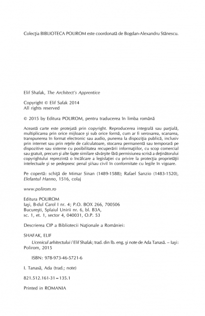 Traducere din limba engleza si note de Ada Tanasa Autoarea bestsellerului international Bastarda Istanbulului Nominalizat, chiar in anul aparitiei, la Walter Scott Historical Novel Prize, romanul Ucenicul arhitectului e o poveste plina de culori si de lumina, care se desfasoara in neuitata vreme a sultanului Soliman Magnificul. Un baiat pirpiriu, numai ochi si par zburlit, coboara de pe o corabie la Istanbul, sa duca un dar fara seaman la seraiul sultanului: un elefant cu totul si cu totul alb. Cei doi sint repede prinsi intr-o inlantuire de istorii tainice, in care se amesteca iubiri fara speranta, viziri plini de cruzime, cadine si sultane viclene, vrajitoare si uneltiri de curte. Nedespartit de prietenul lui, elefantul, baiatul ajunge in scurta vreme ucenicul lui Mimar Sinan, unul dintre cei mai faimosi arhitecti din Imperiul Otoman, alaturi de care ridica, ani in sir, moschee dupa moschee. „O punere in scena spectaculoasa, un roman populat cu armate de aventurieri, tigani misteriosi si curtezane carora nu le lipseste bunatatea, Ucenicul arhitectului este si un poem de dragoste inchinat frumusetii cosmopolite a Istanbulului.” (The New York Times Book Review) „Elif Shafak alege pentru romanul ei un fundal istoric generos, plin de frumusete. Ucenicul arhitectului poate fi citit ca o serie de viniete fascinante, inspirate din alaturarea artei cu religia, a creativitatii cu devotiunea... O carte vibranta, plina de spirit, vie.” (The Washington Post) „Arhitectura este unul dintre subiectele puternice ale lui Elif Shafak. Romanul ei este construit pe mai multe straturi, ce impresioneaza prin splendoarea detaliului imbricat si prin maretia viziunii, o viziune care arata cum ura si egoismul distrug o lume ce poate fi reconstruita numai prin dragoste.” (The Observer)