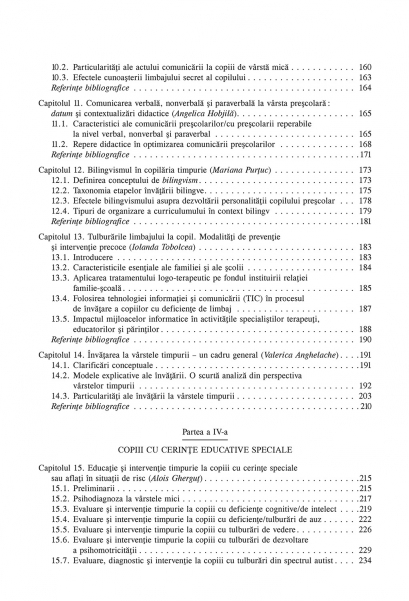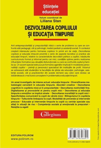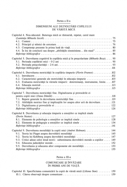 Prefata de Constantin Cucos Anii anteprescolaritatii si prescolaritatii ridica o serie de probleme cu care se confrunta atit pedagogii, cit si psihologii, medicii pediatri si asistentii sociali. In contextul cresterii interesului pentru formarea copilului in primii ani de viata, Dezvoltarea copilului si educatia timpurie prezinta o serie de aspecte teoretice si practice ale educatiei timpurii, relative la caracteristicile dezvoltarii psihice a copiilor, trasaturile curriculumului formal si informal pentru cei mici, conditiile optime pentru realizarea influentelor formative sau situatiile disfunctionale cu care se confrunta copilul si familia sa. Un accent special este pus pe formarea agentilor implicati in modelarea personalitatii copiilor – parintii si personalul specializat din institutiile de profil. Volumul se adreseaza atit studentilor la facultatile de stiinte ale educatiei, psihologie, asistenta sociala, cit si practicienilor din aceste domenii sau celor care doresc sa dobindeasca o mai buna cunoastere in problematica educatiei timpurii.