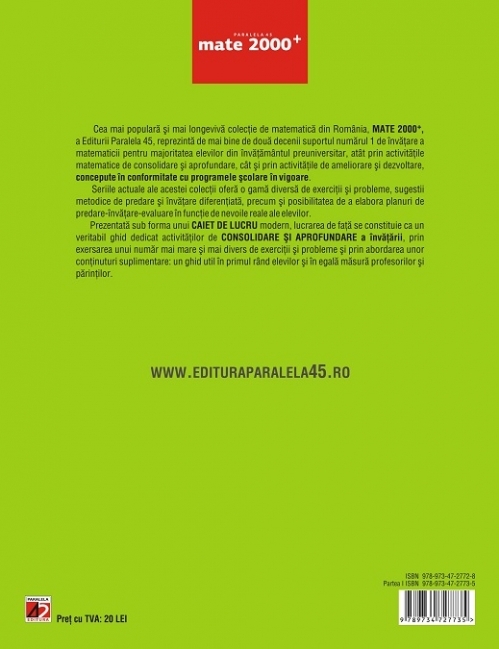 Cea mai populară și mai longevivă colecție de matematică din România, MATE 2000+, a Editurii Paralela 45, reprezintă de mai bine de două decenii suportul numărul 1 de învățare a matematicii pentru majoritatea elevilor din învățământul preuniversitar, atât pentru activități matematice standard, de consolidare și aprofundare, cât și pentru activități de ameliorare și dezvoltare, concepute în conformitate cu programele școlare în vigoare.