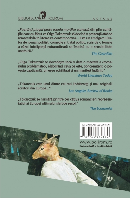 Poartă-ţi plugul peste oasele morţilor etalează din plin calităţile care au făcut ca Olga Tokarczuk să devină o prezenţă atît de remarcabilă în literatura contemporană... Este un amalgam uluitor de roman poliţist, comedie şi tratat politic, scris de o femeie a cărei inteligenţă extraordinară se îmbină cu o sensibilitate anarhică.” (The Guardian)