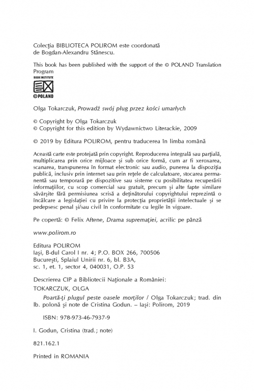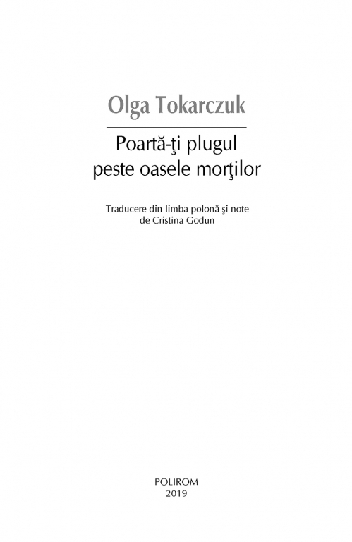 Comandă online cartea "Poartă-ți plugul peste oasele morților" la 52,25 lei isbn 9789734679379 scrisă de Olga Tokarczuk , Cristina Godun, tiparită la editura Polirom face parte din colecția BIBLIOTECA POLIROM -> Actual. cu plata ramburs sau online cu cardul. Momentan titlul "Poartă-ți plugul peste oasele morților" nu este disponibil însa vă puteți înscrie pentru a fi notificat în momenul reaprovizionarii.