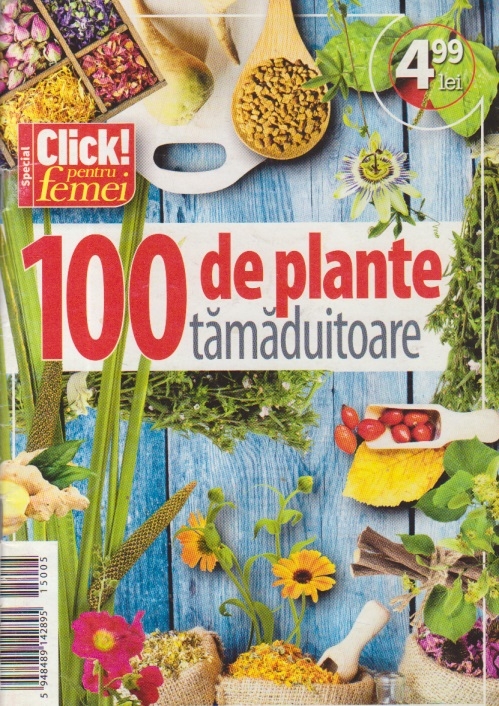 Comandă online cartea "Revista Click pentru femei special - 100 de plante tamaduitoare" la 6,20 lei scrisă de Carmen Eberhat, tiparită la editura Adevarul face parte din colecția Click pentru femei special cu un număr de 82 pagini. cu plata ramburs sau online cu cardul. Momentan titlul "Revista Click pentru femei special - 100 de plante tamaduitoare" nu este disponibil însa vă puteți înscrie pentru a fi notificat în momenul reaprovizionarii.