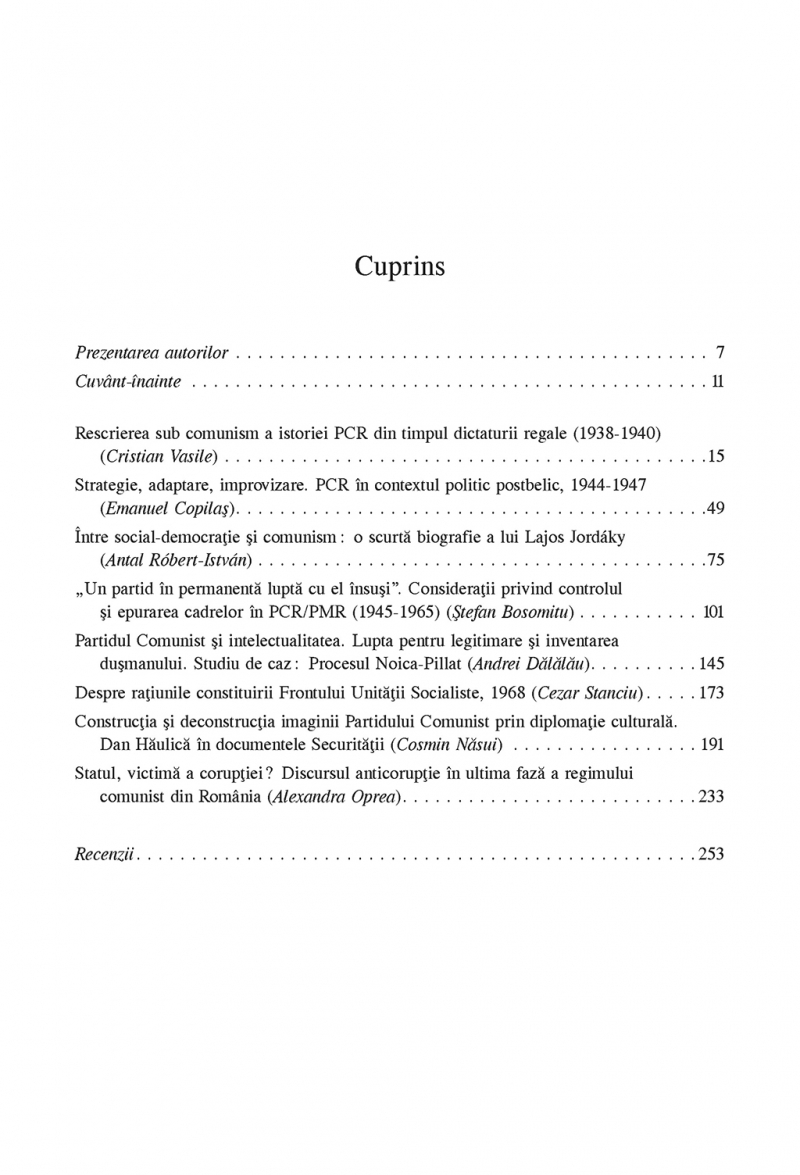 „Fiecare mișcare politică își creează propria memorie istorică, iar mișcarea comunistă din România nu face excepție. Momentele definitorii din evoluția partidului au servit drept mituri de legitimare de‑a lungul întregului secol XX. Rolul avangardist și revoluționar al partidului, rolul conducător spre realizarea societății comuniste, în fapt, rolul de a asigura condițiile implementării unei utopii, precum și afilierea la o rețea transnațională presupuneau ca această structură politică să aibă calități excepționale. Iar dacă acestea nu s‑au regăsit în realitate înainte de 1989, i s‑au atribuit discursiv. Urmând acest fir roșu, al XVI-lea volum al Anuarului IICCMER analizează politica, evoluția și modul de gândire ale Partidului Comunist, în principal, și ale mișcării de stânga, în general, în România ultimilor o sută de ani (1921‑2021). Pe lângă o analiză a reconstrucțiilor discursive de după 1989, cele opt studii surprind evoluțiile politice ale partidului unic și mai ales maniera în care, filtrate de interese și opțiuni de moment, au avut un impact major asupra transformărilor sociale, a dinamicii cotidianului sau a traiectoriilor biografice ale diferiților subiecți.” Coordonatorii