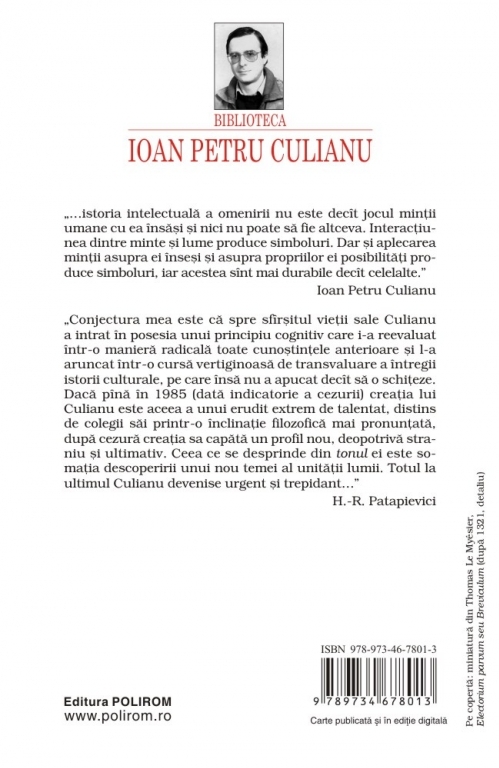 „Conjectura mea este că spre sfîrşitul vieţii sale Culianu a intrat în posesia unui principiu cognitiv care i-a reevaluat într-o manieră radicală toate cunoştinţele anterioare şi l-a aruncat într-o cursă vertiginoasă de transvaluare a întregii istorii culturale, pe care însă nu a apucat decît să o schiţeze. Dacă pînă în 1985 (dată indicatorie a cezurii) creaţia lui Culianu este aceea a unui erudit extrem de talentat, distins de colegii săi printr-o înclinaţie filozofică mai pronunţată, după cezură creaţia sa capătă un profil nou, deopotrivă straniu şi ultimativ. Ceea ce se desprinde din tonul ei este somaţia descoperirii unui nou temei al unităţii lumii. Totul la ultimul Culianu devenise urgent şi trepidant…” (H.-R. Patapievici)