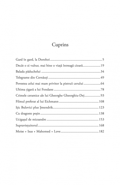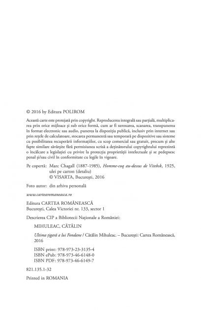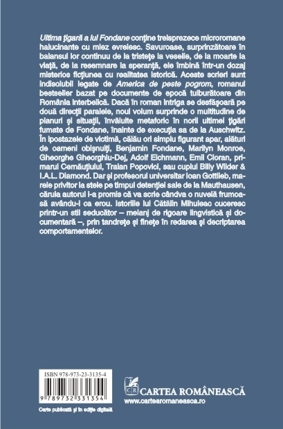 Premiul pentru Proză, pentru anul 2016, acordat de Uniunea Scriitorilor din România, filiala Iaşi Ultima tigara a lui Fondane contine treisprezece microromane halucinante cu miez evreiesc. Savuroase, surprinzatoare in balansul lor continuu de la tristete la veselie, de la moarte la viata, de la resemnare la speranta, ele imbina intr-un dozaj misterios fictiunea cu realitatea istorica. Aceste scrieri sint indisolubil legate de America de peste pogrom, romanul bestseller bazat pe documente de epoca tulburatoare din Romania interbelica. Daca in roman intriga se desfasoara pe doua directii paralele, noul volum surprinde o multitudine de planuri si situatii, invaluite metaforic in norii ultimei tigari fumate de Fondane, inainte de executia sa de la Auschwitz. In ipostazele de victima, calau ori simplu figurant apar, alaturi de oameni obisnuiti, Benjamin Fondane, Marilyn Monroe, Gheorghe Gheorghiu-Dej, Adolf Eichmann, Emil Cioran, primarul Cernautiului, Traian Popovici, sau cuplul Billy Wilder & I.A.L. Diamond. Dar si profesorul universitar Ioan Gottlieb, marele privitor la stele pe timpul detentiei sale de la Mauthausen, caruia autorul i-a promis ca va scrie cindva o nuvela frumoasa avindu-l ca erou. Istoriile lui Catalin Mihuleac cuceresc printr-un stil seducator – melanj de rigoare lingvistica si documentara –, prin tandrete si finete in redarea si decriptarea comportamentelor. „Cea mai frecventa intrebare care mi se adreseaza pe tarim literar este de ce ma preocupa chestiunea Holocaustului romanesc daca nu sint evreu. Raspunsul meu invariabil este ca ma preocupa tocmai pentru ca nu sint evreu. America de peste pogrom si Ultima tigara a lui Fondane trebuie privite ca doua replici la adresa acelui patriotism de tinichea care ne face sa mototolim paginile neconvenabile din istorie si sa le aruncam la cos, in loc sa ni le asumam cu onestitate. Misiunea acestor carti este sa scada nivelul ingrijorator pe care ura rasiala il arata in timpurile noastre si sa faca lumea mai buna pe raza lor de cititori. In alegerea titlului de fata a primat admiratia mea pentru Fondane, aceasta fiinta superioara, care i-a suflat cu superba impertinenta abstinentului Hitler fumul de tigara drept in ochi.” (Catalin Mihuleac)