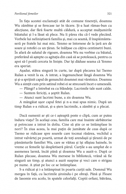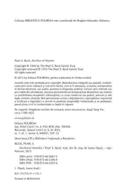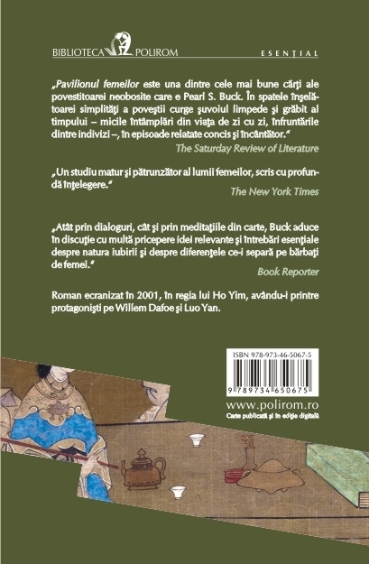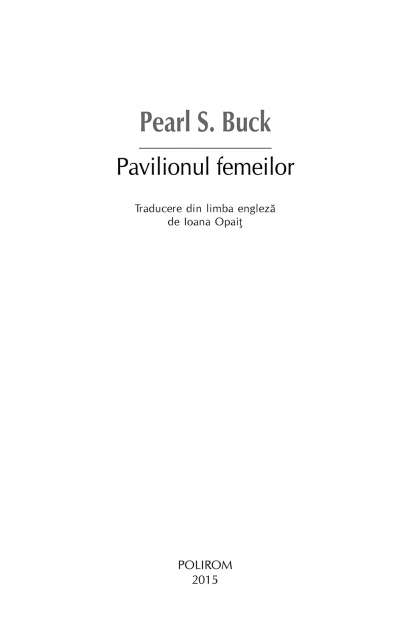 Traducere din limba engleza de Ioana Opait Premiul Nobel pentru Literatura 1938 Roman ecranizat in 2001, in regia lui Ho Yim, avindu-i printre protagonisti pe Willem Dafoe si Luo Yan. Cind doamna Wu, stapina unei case de nobili dintr-o provincie chineza, implineste patruzeci de ani, hotaraste sa se retraga din dormitorul sotului si sa-i aduca acestuia o tinara concubina. Ea ramine insa administratoarea averii familiei si dirijeaza cu tact si fermitate intreaga gospodarie, incercind sa tina sub control pornirile rebele ale nurorilor si sa-si indrume fiii sa respecte vechile traditii. Numai ca acum, in secolul XX, insasi doamna Wu, o femeie educata, incepe sa puna la indoiala orinduielile din trecut. Intilnirea cu un preot strain, fratele Andre, de care ajunge sa se ataseze pe nesimtite, ii transforma radical spiritul si felul in care vede lumea. Pavilionul femeilor a fost considerat unul dintre cele mai bune romane ale lui Pearl S. Buck, iar doamna Wu este, poate, cel mai puternic personaj feminin creat de prozatoarea americana. In acelasi timp, cartea ilustreaza si framintarile unei societati traditionale aflate in pragul unei schimbari radicale, ca urmare a contactelor cu strainii si a modernizarii, ce patrunde lent, dar sigur in aceasta lume inchisa. „Pavilionul femeilor este una dintre cele mai bune carti ale povestitoarei neobosite care e Pearl S. Buck. In spatele inselatoarei simplitati a povestii curge suvoiul limpede si grabit al timpului – micile intimplari din viata de zi cu zi, infruntarile dintre indivizi –, in episoade relatate concis si incintator.” (The Saturday Review of Literature) „Un studiu matur si patrunzator al lumii femeilor, scris cu profunda intelegere.” (The New York Times) „Atit prin dialoguri, cit si prin meditatiile din carte, Buck aduce in discutie cu multa pricepere idei relevante si intrebari esentiale despre natura iubirii si despre diferentele ce-i separa pe barbati de femei.” (Book Reporter)