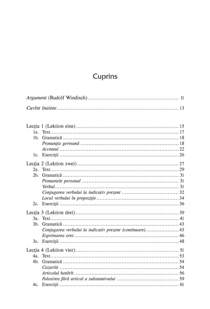 Editia a X‑a revazuta si adaugita Argument de Rudolf Windisch Destinata deopotriva elevilor, studentilor si autodidactilor, Limba germana. Simplu si eficient prezinta intr-un limbaj accesibil si intr-o succesiune logica principalele elemente de gramatica germana, pe care le ilustreaza cu numeroase exemple din vorbirea de zi cu zi si cu exercitii utile pentru fixarea notiunilor invatate. Cheia exercitiilor va permite verificarea cunostintelor, iar CD-ul cu textele si vocabularul lectiilor va ajuta sa va insusiti o pronuntie cit mai corecta. Reguli de pronuntie • Substantivul • Articolul • Pronumele • Verbul • Prepozitiile • Exprimarea deplasarii si situarii • Cuvinte derivate si cuvinte compuse • Adjectivul si adverbul • Acordul adjectivului cu substantivul • Propozitii subordonate • Vocabular uzual • Tabele si sinteze • Exercitii • Cheia exercitiilor
