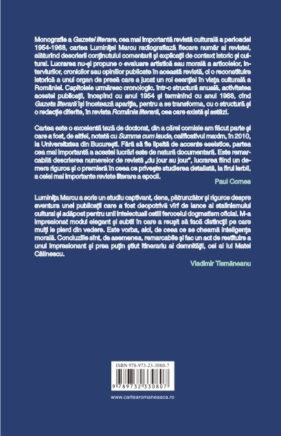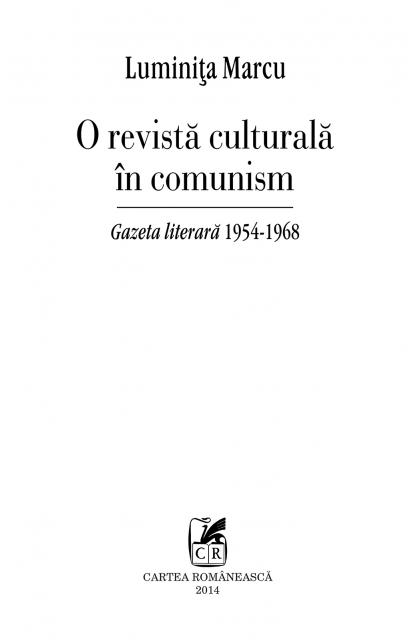 Monografie a Gazetei literare, cea mai importantă revistă culturală a perioadei 1954-1968, cartea Luminiţei Marcu radiografiază fiecare număr al revistei, alăturînd descrierii conţinutului comentarii şi explicaţii de context istoric şi cultural. Lucrarea nu-şi propune o evaluare artistică sau morală a articolelor, in-terviurilor, cronicilor sau opiniilor publicate în această revistă, ci o reconstituire istorică a unui organ de presă care a jucat un rol esenţial în viaţa culturală a României. Capitolele urmăresc cronologic, într-o structură anuală, activitatea acestei publicaţii, începînd cu anul 1954 şi terminînd cu anul 1968, cînd Gazeta literară îşi încetează apariţia, pentru a se transforma, cu o structură şi o redacţie diferite, în revista România literară, cea care există şi astăzi.