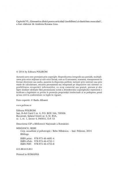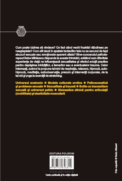 Cum poate iubirea sa vindece? Ce faci cind vechi frustrari rabufnesc pe neasteptate? Cum afli daca in spatele fanteziilor tale nu se ascund de fapt abuzuri sexuale sau emotionale aparent uitate? Bine-cunoscutul psihoterapeut Bebe Mihaescu raspunde la aceste intrebari, aratind cum diferitele experiente de viata ne influenteaza sexualitatea si oferind solutii practice pentru depasirea inhibitiilor, a temerilor sau a eventualelor traume. Celor interesati, autorul le propune tehnici de respiratie, relaxare, hipnoza, autohipnoza, meditatie, autoobservatie, precum si interventii corporale, de la tai chi si yoga la exercitii de stretching. Din cuprins: Universul anatomic • Modele culturale erotice • Psihosomatica si probleme sexuale • Sexualitate si trauma • Bolile cu transmitere sexuala si universul psihic • Gimnastica zilnica pentru articulatii (mobilitate) si elasticitate musculara Capitolul VI, „Gimnastica zilnica pentru articulatii (mobilitate) si elasticitate musculara”, a fost elaborat de Andreea Roxana Linu.