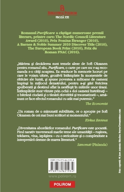 „Marirea si decaderea sint temele alese de Sofi Oksanen pentru romanul sau, Purificare, o carte pe care nu v-as recomanda s-o cititi noaptea. Ea readuce in memorie lucruri pe care le voiam uitate, grozavii intimplate in momentele de ratacire ale lumii, si spune povestea a milioane de oameni impinsi in mijlocul dezastrului, pentru a-si gasi fericirea spulberata si destinul aflat la nesfirsit in miinile unor tirani. Intimplarile sint vazute prin ochii a doi oameni instrainati – o batrina ciudata si o tinara razvratita si traumatizata –, amanunt ce face efectul romanului cu atit mai puternic.” (The Economist)
