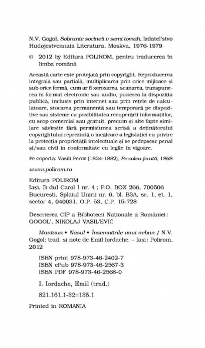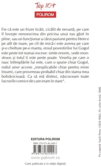 Traducere din limba rusa si note de Emil Iordache Fie ca este un frizer ticait, cicalit de nevasta, pe care il loveste nenorocirea din pricina unui nas gasit in piine, sau un functionar a carui pasiune pentru litere e pe atit de mare, pe cit de mica-i este averea pe care si-o cheltuie pe-o manta, eroul povestirilor lui Gogol este in toate numai excese: simte enorm, vede monstruos si totul ii este peste poate. Veselia pe care o nasc intimplarile lui este, cum o spune chiar Gogol, rodul unor accese „inexplicabile chiar pentru mine insumi, care proveneau probabil chiar din starea mea bolnavicioasa. Ca sa ma distrez, nascoceam toate lucrurile comice de care eram in stare”.
