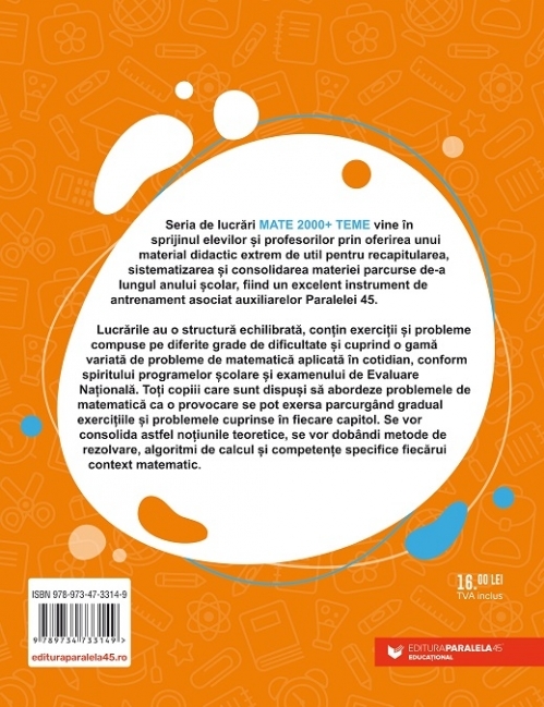 Seria de lucrări MATE 2000+ TEME vine în sprijinul elevilor și profesorilor prin oferirea unui material didactic extrem de util pentru recapitularea, sistematizarea și consolidarea materiei parcurse de-a lungul anului școlar fiind un excelent instrument de antrenament asociat auxiliarelor Paralelei 45.
