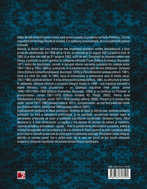 Ediția de față prezintă pentru prima oară textul complet al jurnalului lui Radu Petrescu, cel mai important din întreaga literatură română. E o restituire monumentală, de o excepțională importanță culturală. Autorul, la rândul său unul dintre cei mai importanți prozatori români dintotdeauna, a ținut jurnal din adolescență, din 1946 (de la 19 ani; se născuse pe 31 august 1927) și până la final, în 1982 (s-a stins din viață pe 31 ianuarie 1982, la 54 de ani). Constient de valoarea notelor sale zilnice, a publicat un prim eșantion în culegerea intitulată Proze (Editura Eminescu, București, 1971; textul din deschidere: Jurnal). A decupat ulterior secvențe compacte din caietele anilor 1951-1954 și 1961-1964 și, prelucrate, le-a transformat în cărți de sine stătătoare: Ocheanul întors (Editura Cartea Românească, București, 1978) și Parul Berenicei (aceeași editură, 1981). Cînd s-a stins din viață, în 1982, lucra la transcrierea și prelucrarea unui al treilea calup, 1957-1960, publicat postum: A treia dimensiune (aceeași editura, 1984, cu alte proze și eseuri în Addenda). Editarea efectivă a jurnalului integral începe în 1999 – sub îngrijirea devotată a Adelei Petrescu, soția prozatorului - cu Catalogul mișcărilor mele zilnice. Jurnal 1946-1951/1954-1956 (Editura Humanitas, București, 1999) și va continua cu Prizonier al provizoratului. Jurnal 1957-1970 (Editura Paralela 45, Pitești, 2002), Pentru buna întrebuințare a timpului. Jurnal 1971-1976 (aceeași editura, 2009), Prezent și în același timp străin. Jurnal 1977-1982 (aceeași editura, 2011). Complementar, au mai fost publicate notele din Ocheanul întors. Caiet jurnal 1956 (aceeași editura, 2001). După această restituire în etape succesive, rămânea de făcut și ultimul pas: editarea unitară a jurnalului. Cu încă o operațiune preliminară, și ea esențială: recuperarea textului inițial al calupurilor prelucrate de autor și publicate sub titlurile menționate: Ocheanul întors, Parul Berenicei și A treia dimensiune. La capatul a trei decenii de eforturi de editare și reeditare, volumul de față nu procedează – așadar – doar la juxtapunerea secvențelor succesive, având și meritul considerabil de a le restaura și de a le reinsera în fluxul general pe cele cunoscute până acum doar în formele prelucrate de autor pentru publicarea separată. Rezultatul: textul integral, definitiv al marelui jurnal, într-o ediție-reper, de la care vor porni de-aici încolo viitoarele exegeze și viitoarele republicări ale acestei extraordinare capodopere.