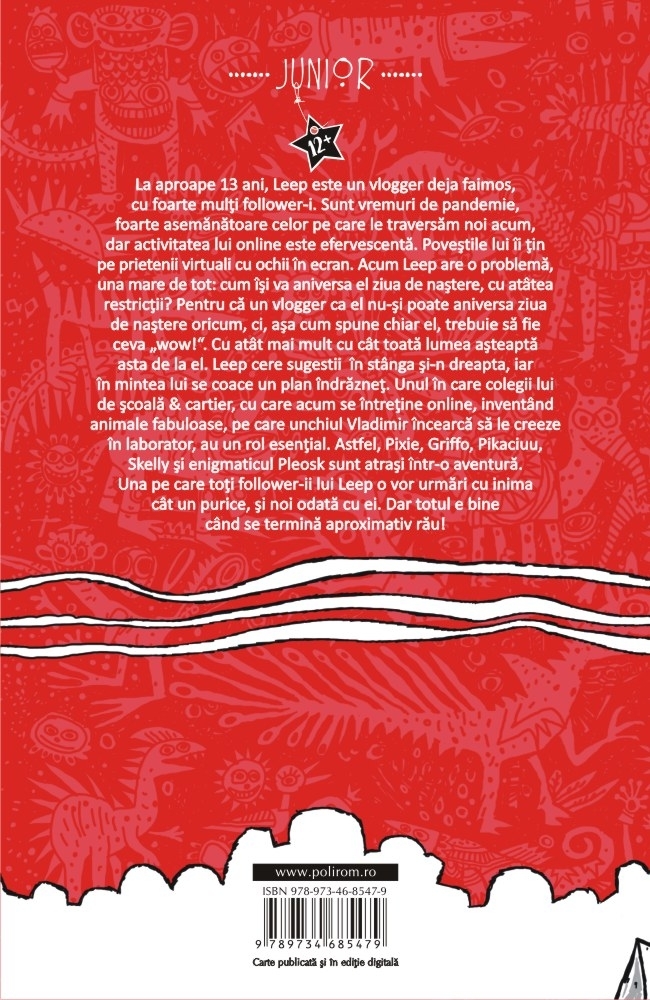 La aproape 13 ani, Leep este un vlogger deja faimos, cu foarte mulţi follower-i. Sînt vremuri de pandemie, foarte asemănătoare celor pe care le traversăm noi acum, dar activitatea lui online este efervescentă. Poveştile lui îi ţin pe prietenii virtuali cu ochii în ecran. Acum Leep are o problemă, una mare de tot: cum îşi va aniversa el ziua de naştere, cu atîtea restricţii? Pentru că un vlogger ca el nu-şi poate aniversa ziua de naştere oricum, ci, aşa cum spune chiar el, trebuie să fie ceva „wow!”. Cu atît mai mult cu cît toată lumea aşteaptă asta de la el. Leep cere sugestii în stînga şi-n dreapta, iar în mintea lui se coace un plan îndrăzneţ. Unul în care colegii lui de şcoală & cartier, cu care acum se întreţine online, inventînd animale fabuloase, pe care unchiul Vladimir încearcă să le creeze în laborator, au un rol esenţial. Astfel, Pixie, Griffo, Pikaciuu, Skelly şi enigmaticul Pleosk sînt atraşi într-o aventură. Una pe care toţi follower-ii lui Leep o vor urmări cu inima cît un purice, şi noi odată cu ei. Dar totul e bine cînd se termină aproximativ rău!