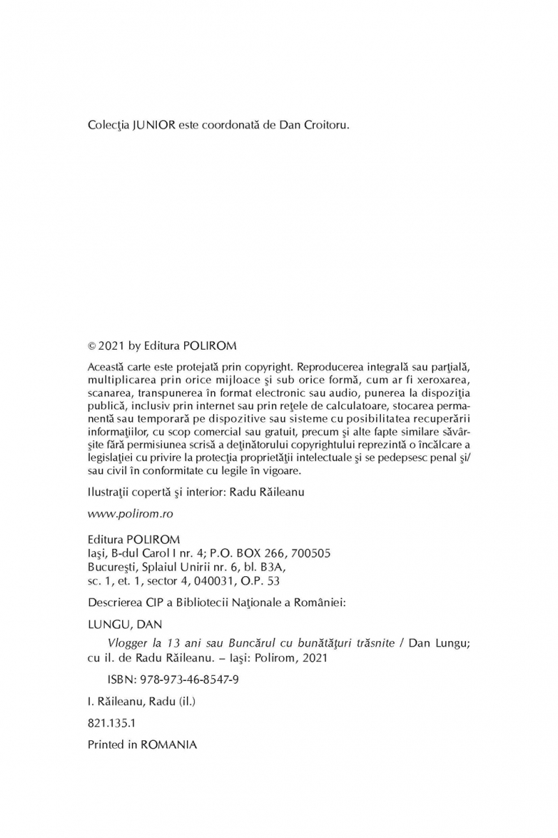 Comandă online cartea "Vlogger la 13 ani sau Buncărul cu bunătățuri trăsnite" la 40,59 lei isbn 9789734685479 scrisă de Dan Lungu, tiparită la editura Polirom face parte din colecția JUNIOR. cu plata ramburs sau online cu cardul. Momentan titlul "Vlogger la 13 ani sau Buncărul cu bunătățuri trăsnite" nu este disponibil însa vă puteți înscrie pentru a fi notificat în momenul reaprovizionarii.