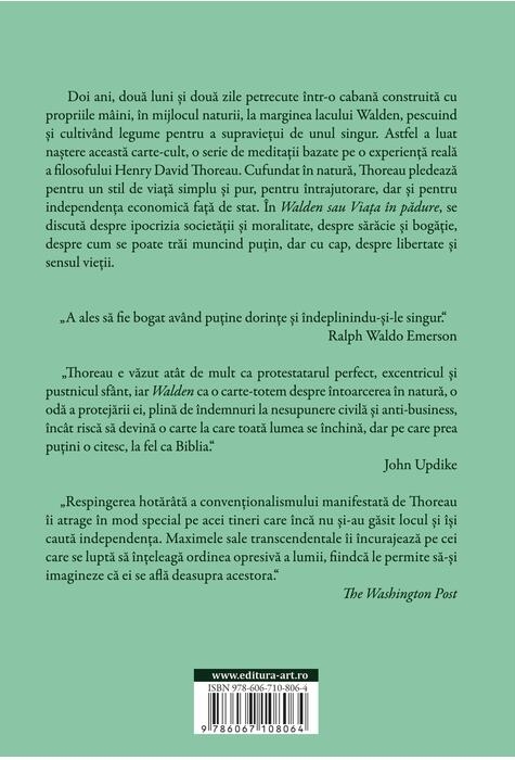 „Odată cu viața în izolare și fără prea multă libertate de mișcare, se vorbește din ce în ce mai des despre importanța unui „petic de pământ”, care să ofere aer curat și spațiu de mișcare, și despre legătura vitală cu natura, de care locuitorii orașelor au fost nevoiți să se țină departe. Nu se putea găsi un moment mai potrivit pentru reeditarea volumului Walden sau Viața în pădure, în care scriitorul american Henry David Thoreau și-a adunat însemnările despre cei doi ani, două luni și două zile pe care i-a trăit în inima pădurii, într-o casă ridicată de el, la jumătatea secolului 19. Walden e un manifest al vieții simple, trăite în acord cu legile naturii, cu multă atenție la nevoile spiritului.” Citește un fragment pe Scena9.