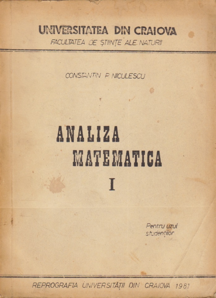 Comandă online cartea "Analiza Matematica, Volumul I - Pentru uzul studentilor" la 26,40 lei scrisă de Universitatea din Craiova , Constantin Niculescu, tiparită la editura Reprografia Universitatii din Craiova face parte din colecția Facultatea de Stiinte ale Naturii în anul 1981. cu plata ramburs sau online cu cardul. Momentan titlul "Analiza Matematica, Volumul I - Pentru uzul studentilor" nu este disponibil însa vă puteți înscrie pentru a fi notificat în momenul reaprovizionarii.