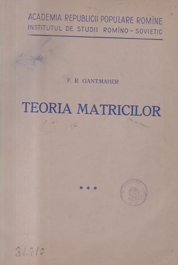 Comandă online cartea "Teoria Matricilor, Volumul al III-lea (Gantmaher)" la 26,40 lei scrisă de F. R. Gantmaher, tiparită la editura Academiei Republicii Populare Romane cu un număr de 296 pagini categorie Matematici superioare / speciale, Matematica, Manuale scolare, Învățamânt - Educație. cu plata ramburs sau online cu cardul. Momentan titlul "Teoria Matricilor, Volumul al III-lea (Gantmaher)" nu este disponibil însa vă puteți înscrie pentru a fi notificat în momenul reaprovizionarii.